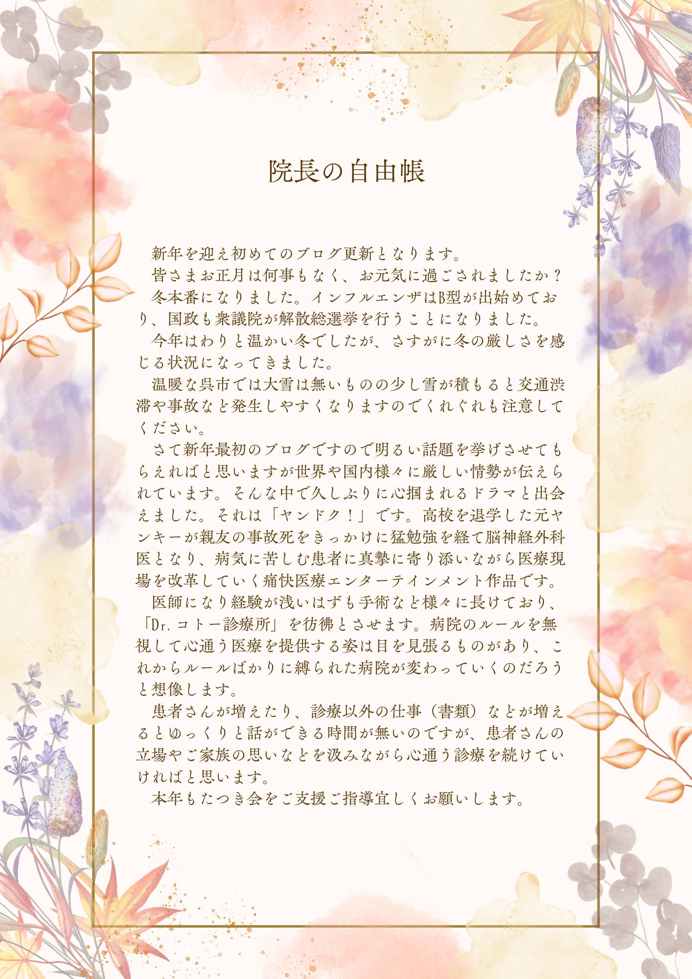 たつき便り 院長の自由帳 2025.05.23 院長の自由帳 2026.2.14 2026.1.21 2025.12.15 2025.11.24 2025.10.16 2025.9.15 2025.8.10 2025.7.20 2025.6.16 2025.5.17 一覧
